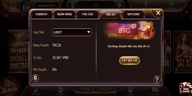 Bước 2: Chọn phương thức “Tiền ảo” → Chọn loại tiền và hiện tại chỉ cổng game chỉ đang hỗ trợ USDT → Click vào “Lấy địa chỉ”.