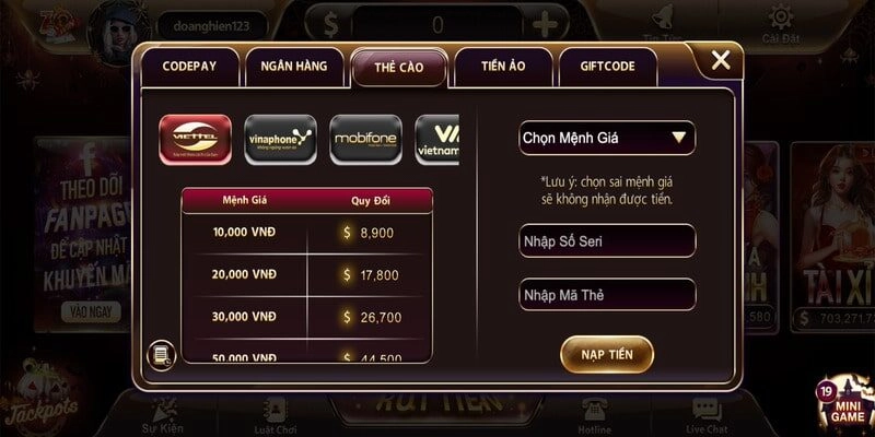 Ngoài 2 phương thức nêu trên, người chơi còn có thể nạp tiền Zowin qua thẻ cào Viettel, Vinaphone, Vietnamobile và Mobiphone. Hiện tại, cổng game đang hỗ trợ hạn mức từ 10K đến 1 triệu đồng. Các bạn hãy tiến hành lần lượt các bước như dưới đây: